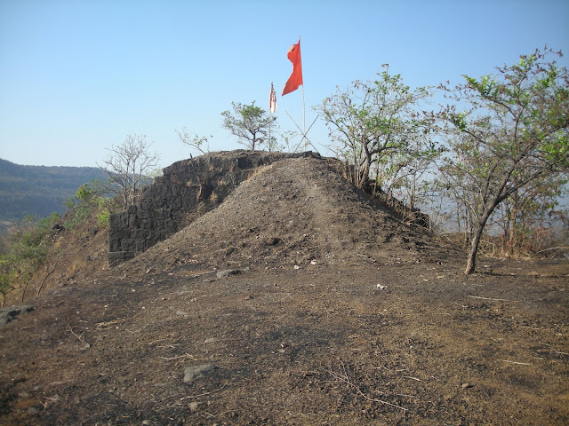 या सपाटीवर दोन उध्वस्त वास्तुंचे अवशेष पहायला मिळतात. सपाटीच्या पुढील भागात एक लहानसा उंचवटा असुन त्यापुढील भागात सपाटीवर किल्ल्याचा उत्तर टोकावरील बुरुज आहे.