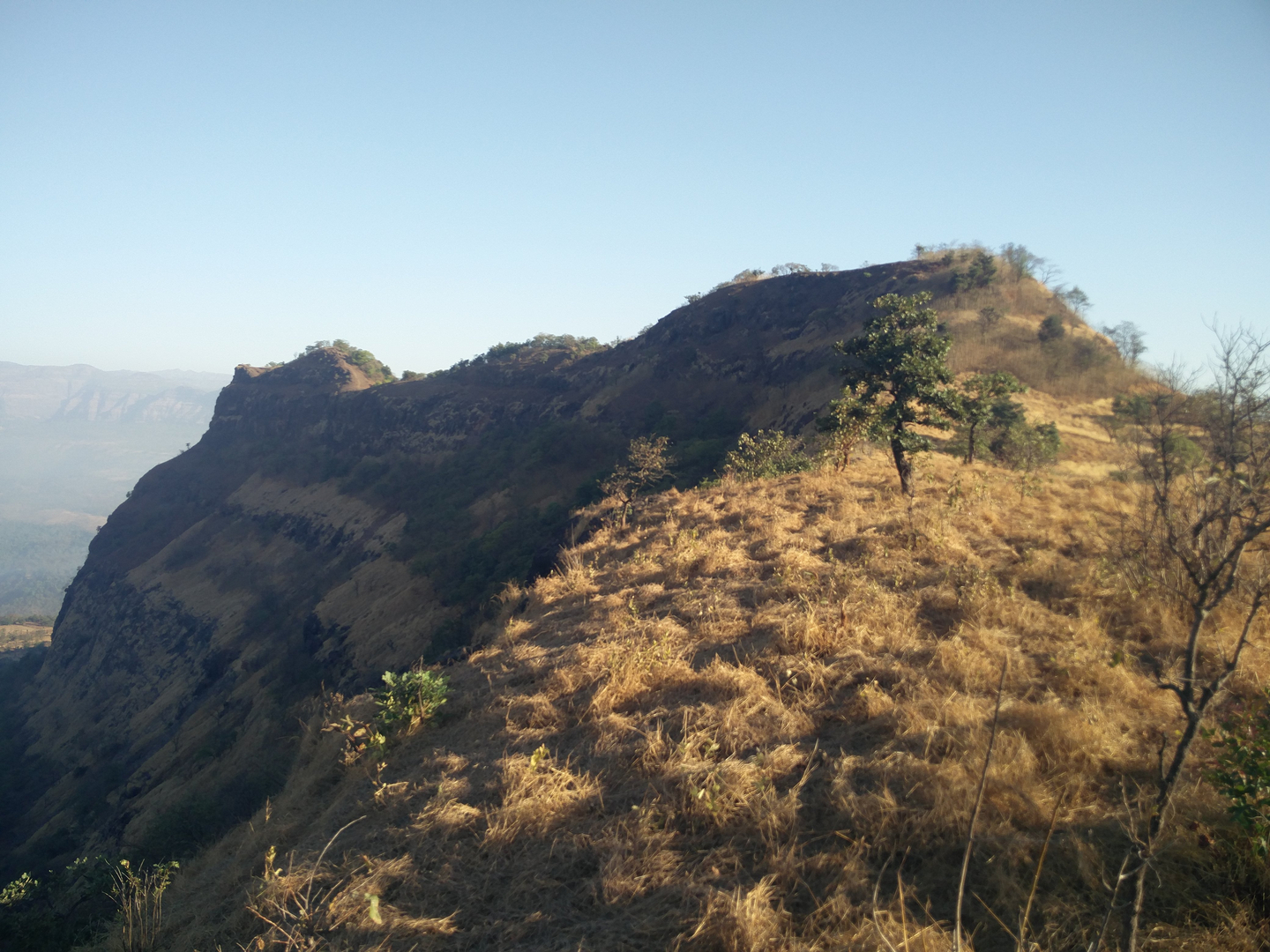येथुन समोर कडा उजवीकडे व दरी डावीकडे ठेवत सरळ जाणारी वाट दिसते. गडाच्या डोंगरावर असलेले गवत गावकरी गुरांसाठी कापुन आणत असल्याने हि वाट चांगलीच मळलेली आहे. या वाटेने साधारण १५ मिनिट चालल्यावर एक छोटा चढ चढून आपण लहानशा सपाटीवर येतो.